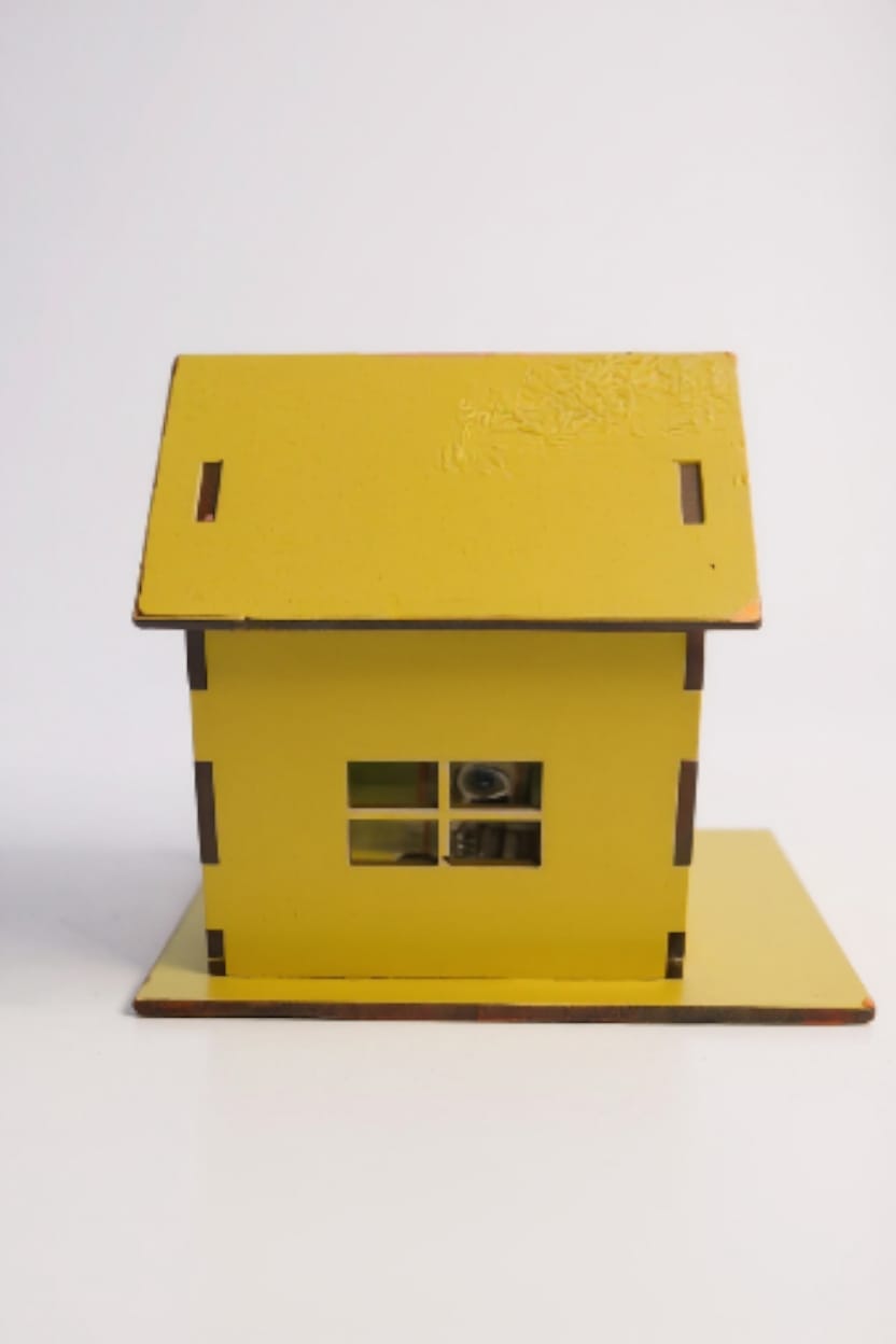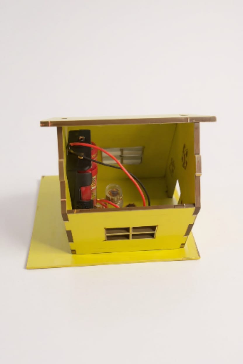 Ahşap parçalar kolayca birleştirilir; içerisine yerleştirilen devre sayesinde evin ışıkları açılıp kapanabilir.